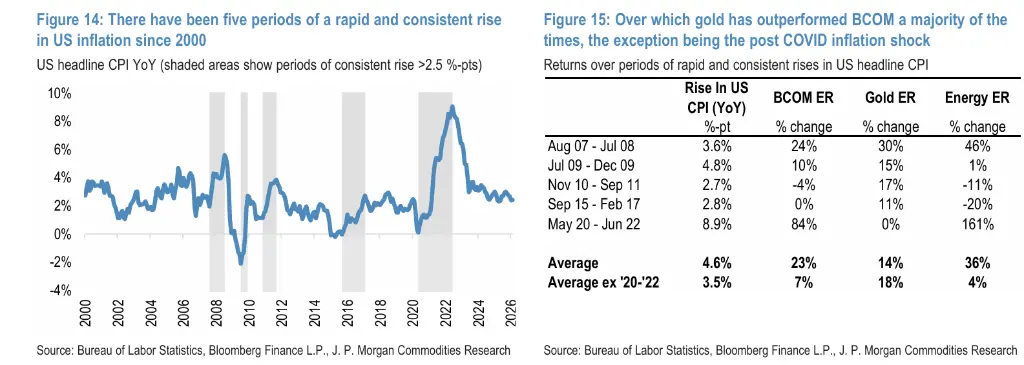 疫情后通胀系需求正向冲击与供应链受限叠加所致,大宗商品整体涨幅远超黄金,属特殊情形。摩根大通认为,若此次油价冲击演变为滞涨环境,黄金的通胀对冲价值将更加突出。