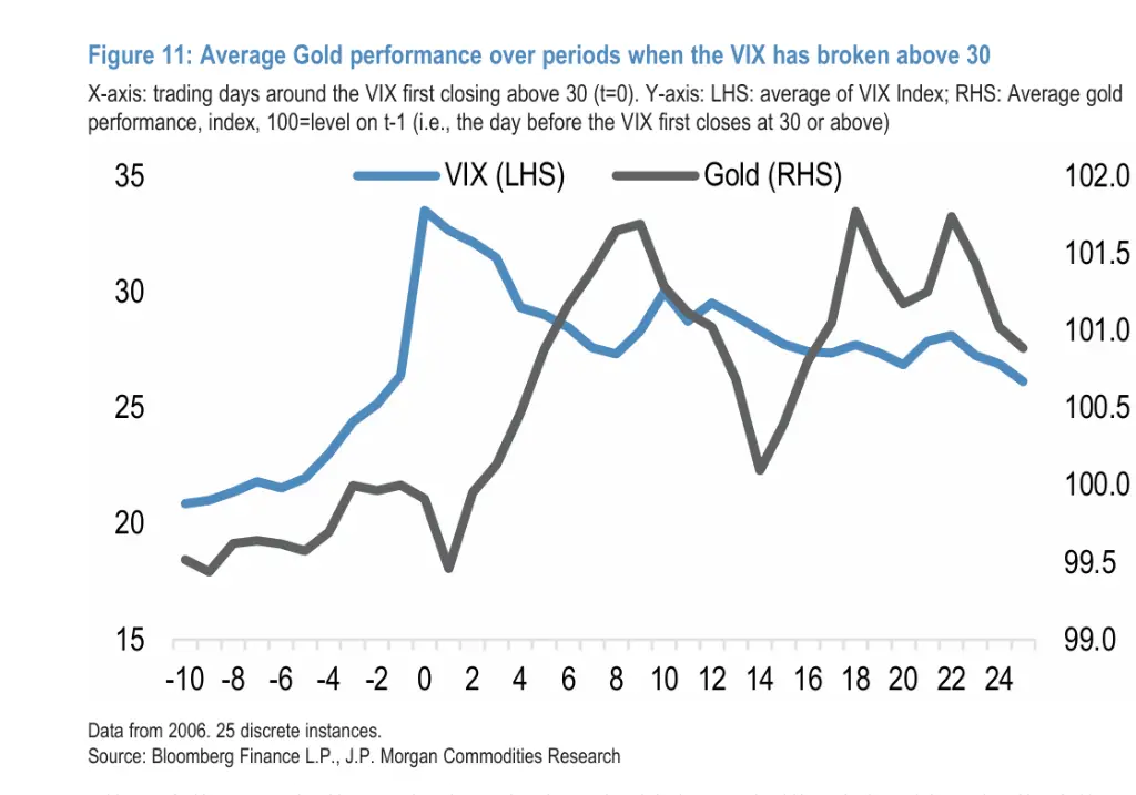 摩根大通梳理了自2006年以来VIX首次收盘突破30的25个独立事件后发现:抛售压力在突破后最初两个交易日最为集中,金价平均累计下跌约0.5%;但从第三个交易日起,金价平均即出现持续且明显的反弹;至第4个交易日,金价平均已收复全部失地并超越突破前水平;至第约10个交易日,从低点至峰值的平均涨幅超过2%。